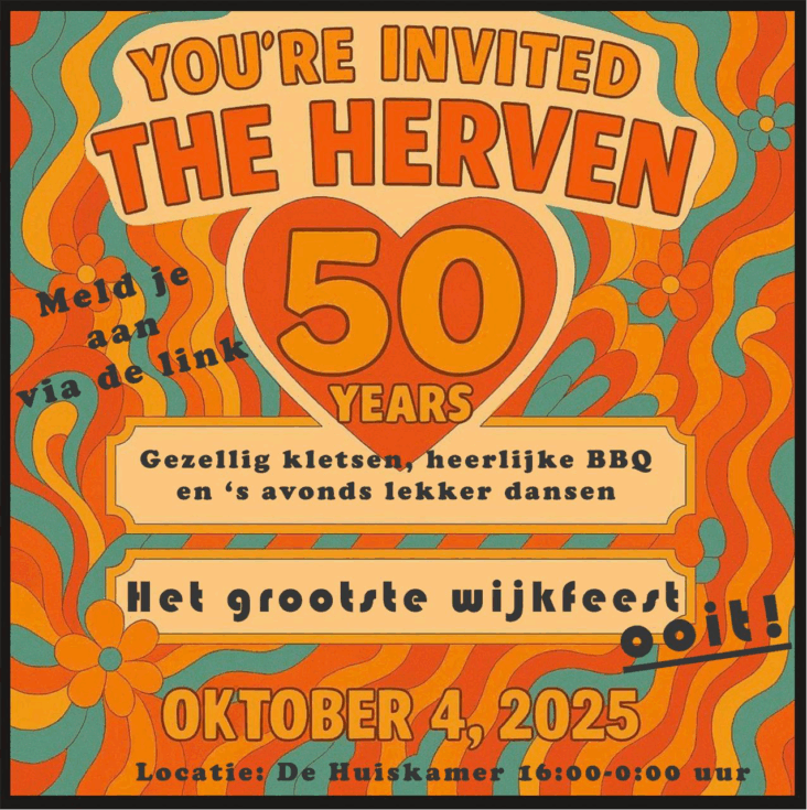 Dit jaar wordt Het Hervenfeest groter dan ooit! 50 jaar De Herven, hier moet je bij zijn. Vanaf 16:00 uur is er een borrel in De Huiskamer. Daarna een heerlijk BBQ die je niet mag missen. Niemand hoeft thuis de aardappels te koken, we eten met zo veel mogelijk mensen uit de wijk (tegen een kleine vergoeding). Aansluitend mogen de voetjes van de vloer en er is uiteraard een jaren 70-dansvloer. Voor mensen die rustig willen kletsen en zitten is er ook ruimte.